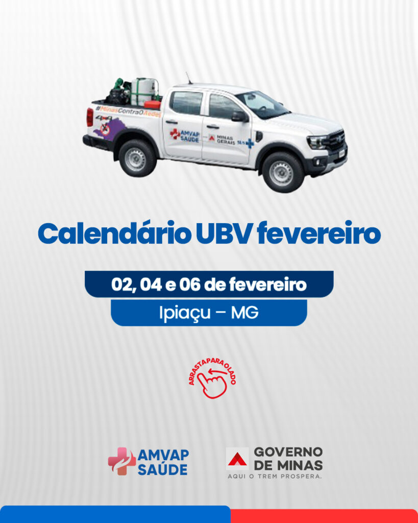 Para reforçar as ações de combate ao mosquito Aedes aegypti, transmissor da dengue, zika e chikungunya, o Consórcio AMVAP Saúde, em parceria com o Município de Ipiaçu, realizará a aplicação de UBV – Ultra Baixo Volume (Carro Fumacê) em datas estratégicas no município. Local: Ipiaçu – MGDatas: 02, 04 e 06 de fevereiro A ação tem como objetivo reduzir a população do mosquito adulto e fortalecer as medidas de prevenção às arboviroses. Para garantir maior eficácia do serviço, é fundamental a colaboração da população durante a aplicação. Orientações à população: O combate ao Aedes aegypti é um trabalho contínuo e depende do esforço conjunto entre o poder público e a comunidade. A iniciativa reforça o compromisso da AMVAP Saúde com a promoção da saúde e a prevenção de doenças em toda a região. A prevenção começa dentro de casa. Juntos, protegemos vidas.